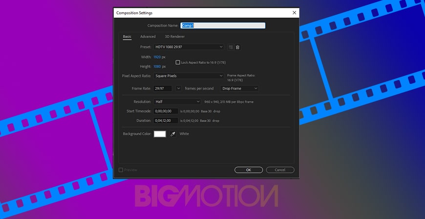 - نام کامپوزیشن: در این محل یک نام به دلخواه برای کامپوزیشن خود تایپ کنید مثال: bigmotion.ir
