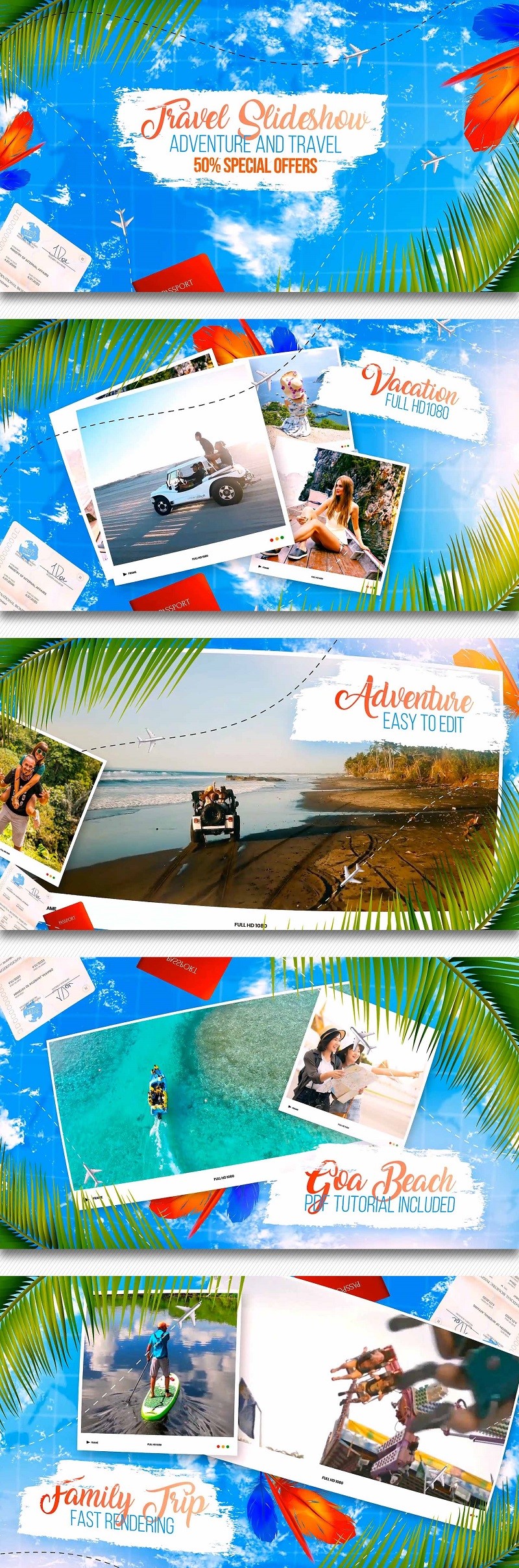 بیایید فیلم نمایشی سفر تابستانی یا خاطرات تعطیلات خود را بسازیم !!! اسلایدشو آماده افتر افکت adventure به شما کمک می کند تا با چند کلیک ، رسانه باز یا آلبوم های ویدیویی سفر را روشن ، رنگارنگ و پر نشاط ایجاد کنید! خانواده و دوستان خود را با فیلمبرداری فراموش نشدنی از اسلایدها و عناوین خاطرات تابستان یا مهمانی یا تولدت مبارک غافلگیر کنید! اسلایدشو آماده افتر افکت adventure یک پروژه افترافکت سفارشی سازی با کیفیت بالا ، به خوبی سازمان یافته و آسان است. فقط تصویر یا فیلم خود را رها کنید ، متن را ویرایش کنید ، صدا اضافه کنید و از نتیجه لذت ببرید!